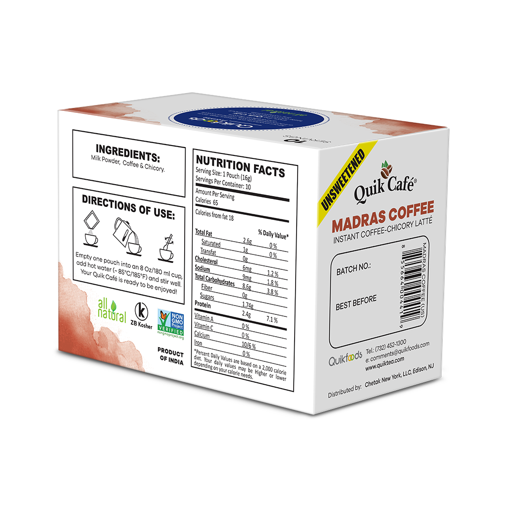 Sometimes you just need an instant (but still tasty!) cup of coffee. And sometimes you want all the creamy flavor of a latte but without the hassle. Luckily, QuikCafe has the perfect solution with our Madras Coffee – our expression of the authentic Filter Coffee or Kaapi from South India. QuikCafe is a prefect blend of Arabica, Robusta coffees and chicory with the right proportion of milk for a New Orleans style Chicory coffee and it is now available in the unsweetened version. It has all the flavor of a smooth and full-bodied coffee and it only takes a few seconds to make!
